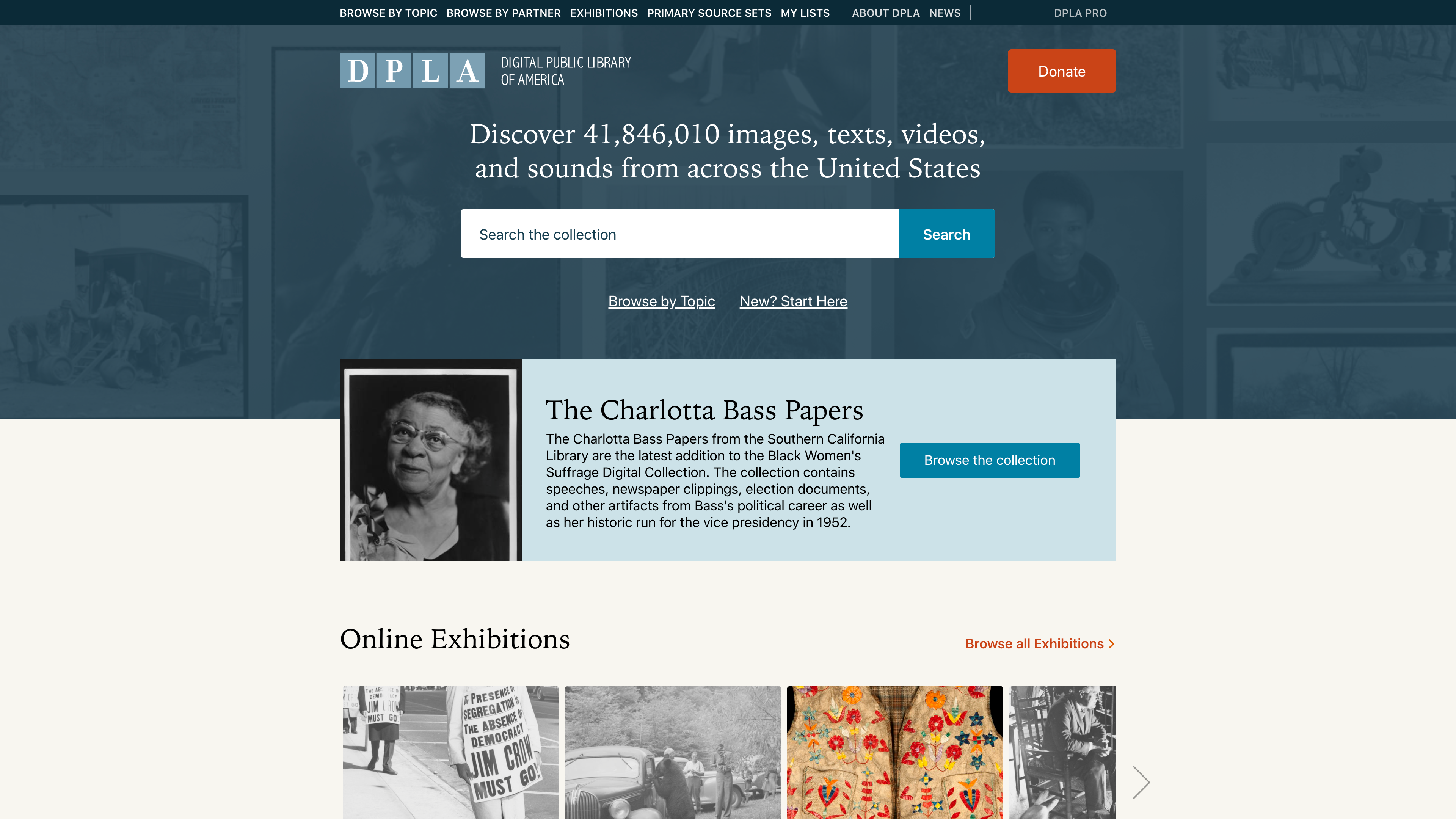 The Digital Public Library of America (DPLA) is a US project aimed at providing public access to digital holdings in order to create a large-scale public digital library. DPLA can help you find the resources you need for your research project. The portal makes it easy to search the digital collections of thousands of libraries, archives, and museums nationwide, all in one website.