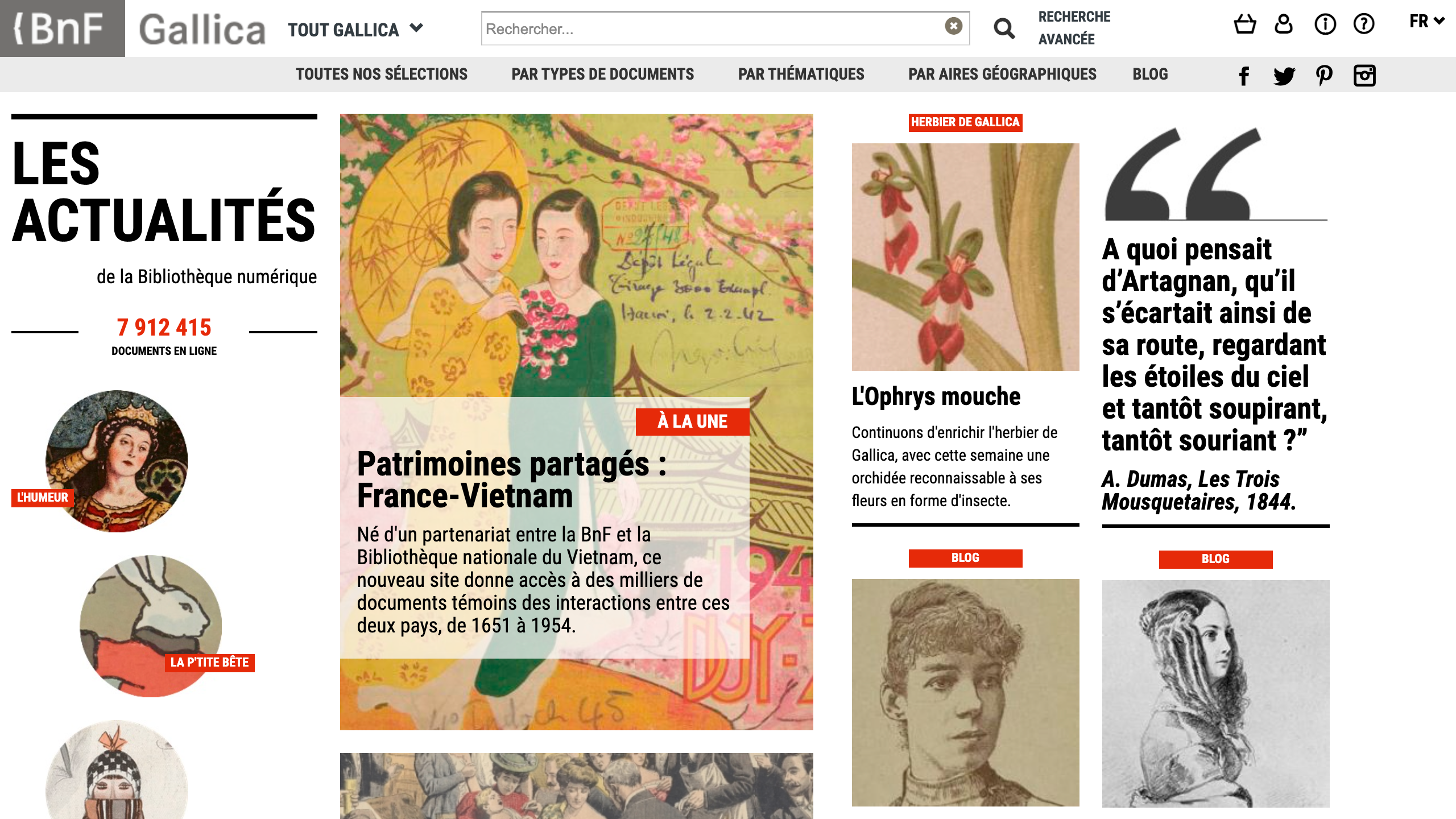 Gallica is one of the major digital libraries available for free via the Internet. It provides access to any type of document: printed documents (books, press and magazines) in image and text mode, manuscripts, sound and iconographic documents, maps and plans.\