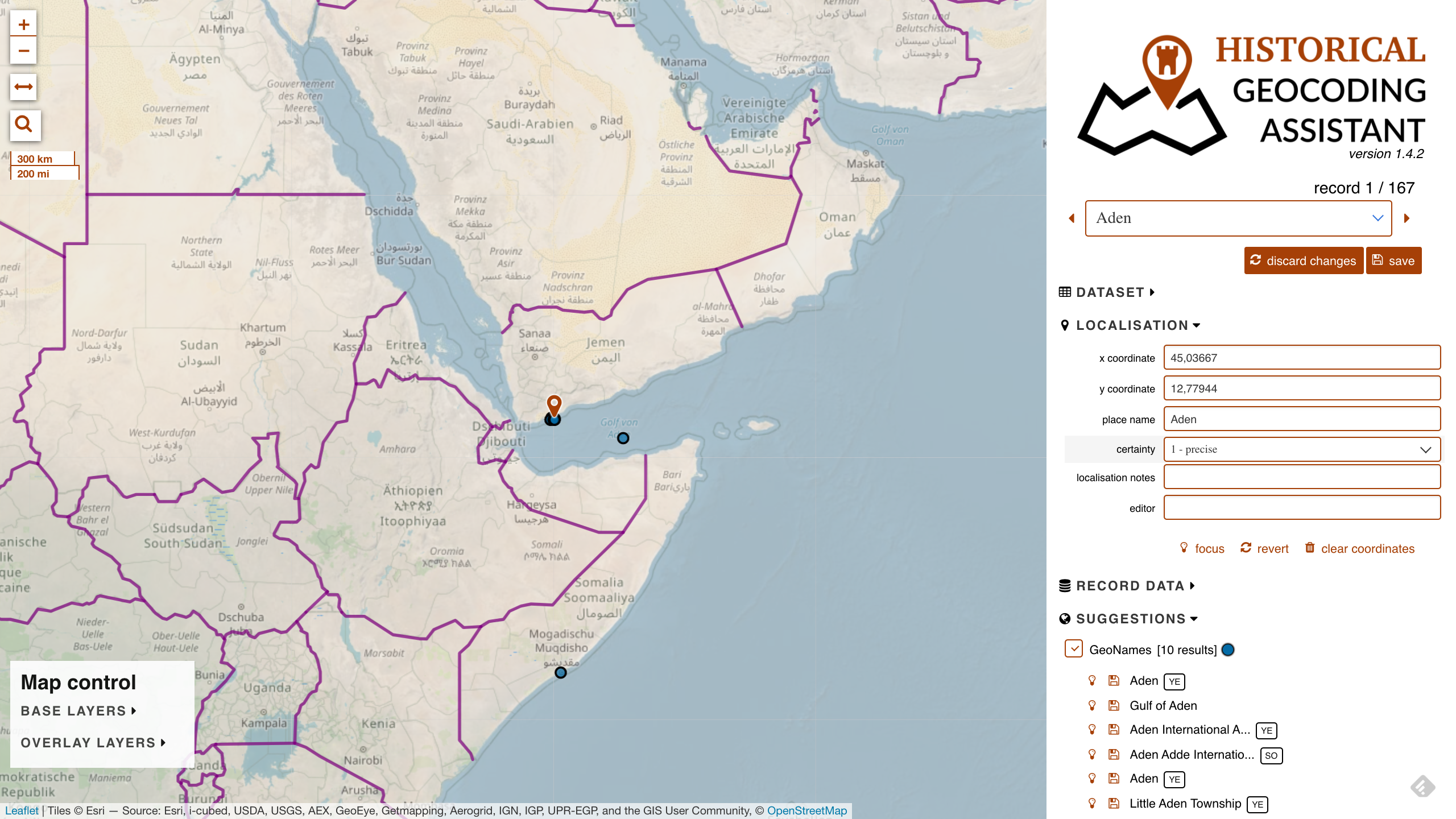 The “Historical Geocoding Assistant” is an open-source browser-based application for assigning geographic coordinates in a more convenient and faster way than copy-pasting them from services such as Google Maps. The application was designed with historical projects in mind but is suitable for any geocoding work.