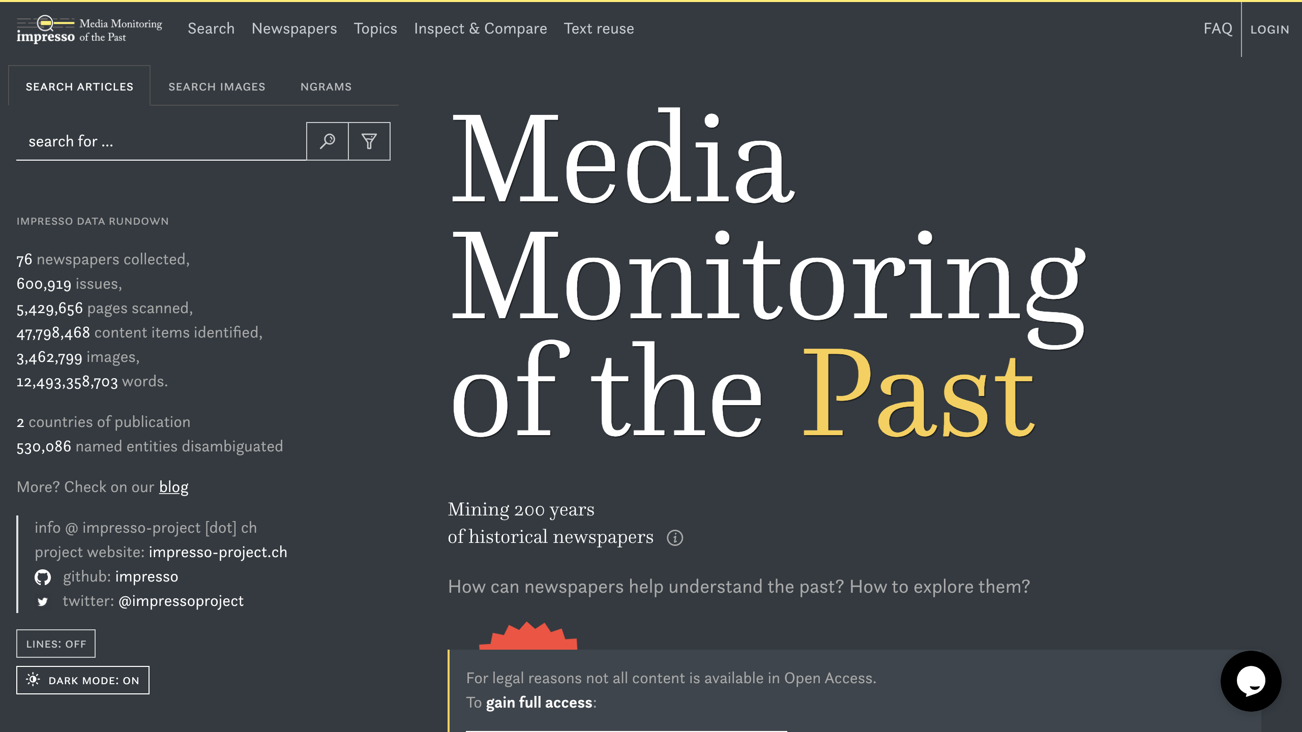 The impresso project's main OBJECTIVE is to develop a media monitoring suite for historical newspapers driven by research objectives in computational linguistics, history and design.