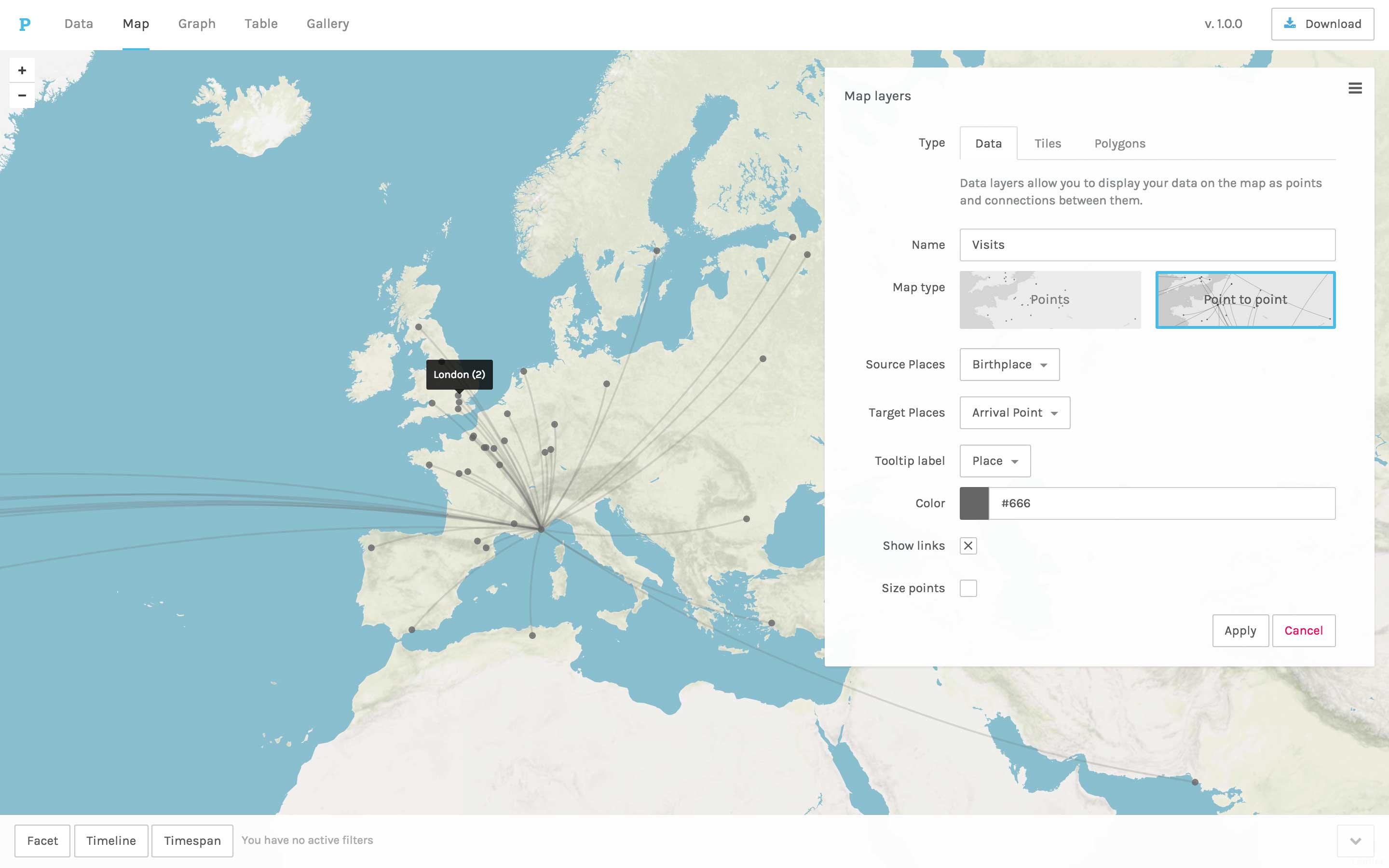 Points on the map can be sized to represent their relative magnitude within your data. With the map’s tooltip function you can select which information will be displayed when hovering over a specific point on the map. Zoom in and out using the + and – buttons. Export the nodes and links of Map visualizations (though not the Map background itself) as .svg files.
